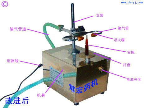传统的安瓿瓶熔封机,由控制箱和熔封台两部分组成,在长期使用中发现有如下缺点:准备时需要临时接插助燃气泵管;控制箱和熔封台摆放调节不方便;使用完毕须拔去气管,再分两部分提拿、搬动、收存。重复使用时,容易出现:控制台和熔封台配套混乱,接插不顺,火焰调整不稳,丢失零配件情况。为此,我们将两体机改进为一体机,助然气泵管已事先接插好,使用时,只需接通煤气或石油液化汽,调整煤气和助燃气开关,即可得到均匀集中的火焰。加热安瓿时,可缓慢旋转圆形安瓿摆放平台,使瓶颈加热均匀,待软化时,用镊子将安瓿瓶颈上端往上拉断,安瓿瓶颈下方即可光滑熔封。