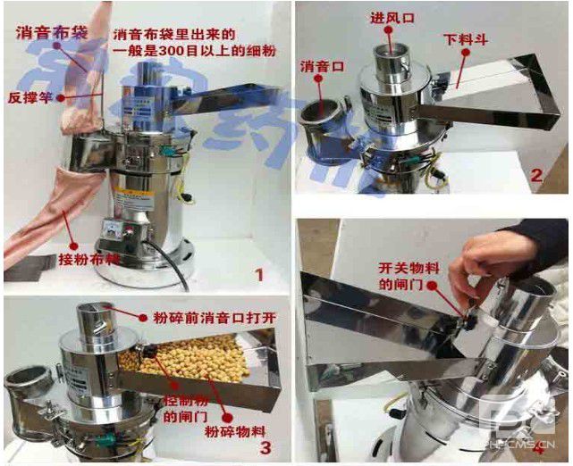 1、准备工作:打开盖,根据需要粉碎的细度换上筛网。装上直铁棒、接料袋、防尘袋,检查粉碎腔是否有异物(开机前必须为空)。拧紧上盖和粉碎腔的蝶形螺帽。