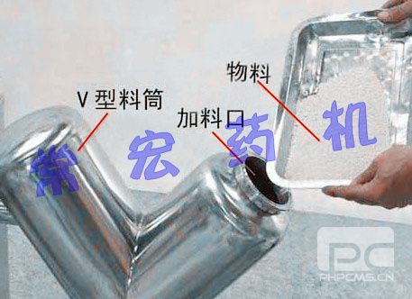 本机一端装有电机与减速机,电机功率通过皮带传给减速机,减速机再通过联国器传给V型桶。使V型桶连续运转,带动桶内物料在桶内上、下、左、右进行混合。