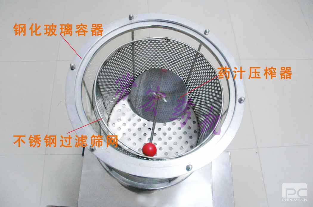 b、煎药完毕,提起药煲内的过滤网斜放在煎药煲上口,用挤压器的压盘挤压布袋内药渣,使药液沥尽。