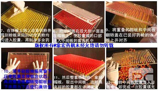 胶囊填充板填充一次187粒胶囊,它由有机玻璃板加工而成的导向排列盘、帽板、中间板、体板和刮粉板组成,色泽光亮、韧性好、材料厚、可受热消毒,符合生产药品食品卫生要求;尺寸精密、使用简单、灌装快速方便、装量均匀;仿机械自动排列设计,胶囊排列速度快、自动排列率高;实行整板自动排列、整板灌装药粉、整板盖帽锁合、工效高、胶囊合格率高,是目前国内理想的非机械胶囊填充工具。