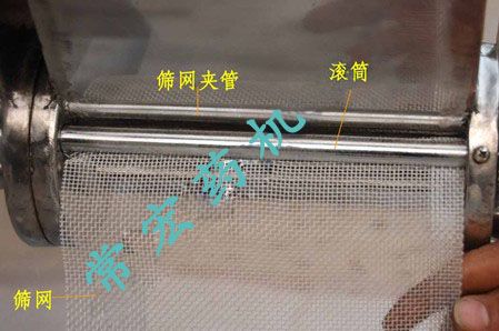 3、筛网夹管:装置在旋转滚筒的两旁,用钢管制造,中间开有一条长槽,筛网的两端嵌入槽内,转动手轮将筛网包在旋转滚筒的外圆上,手轮内挡有刺轮撑住,松紧可以调节。