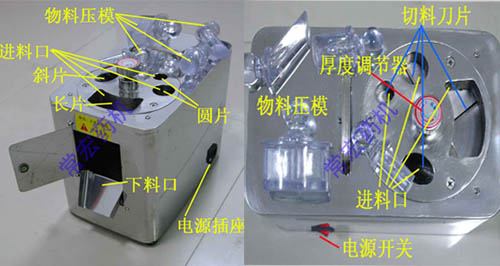 a 入料时,小块状物料切片时,应用塑料压模压住切片,否则会有物料跳动现象产生,切不到位