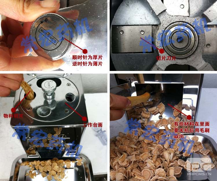 本机选用单相电机配套,采用高档轴承,并安装四把刀片在刀盘上,速比慢而切片功效高,切片厚薄可以调节,广泛适用于中药房、药店、中药加工场等。本机具有体积少、效率高、操作简便、精巧美观,即省电又安全等特点。