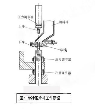 药片压片机的下冲的冲头由中模空下端进入中模孔,封住中模孔底,利用加料器向中模孔中填充药物,上冲的冲头从中模孔上端进入中模孔,并下行一定距离,将药粉压制成片;随后上冲上升出孔,下冲上升将药片顶出中模孔,完成一次压片过程;下冲下降到原位,准备再一次填充。