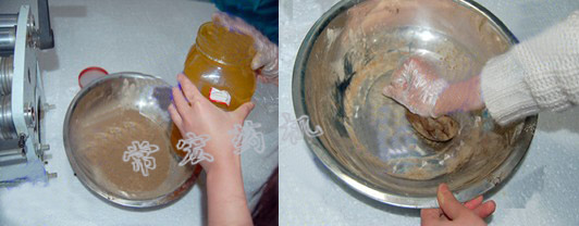 1、混料: 首先把粉碎好的物料放在容器里面,适量的加入蜂蜜,然后进行搅拌
