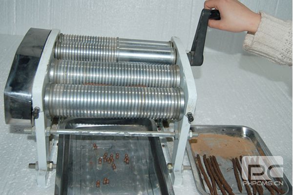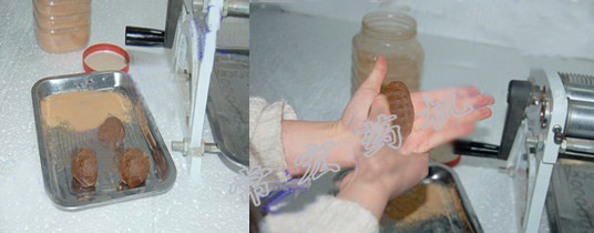 2、拌药软硬要适中,料太硬时药条在两轮间打滑空转,搓不下药丸,料太软时药条会粘附在搓丸轮的凹槽里,造成清理的困难。