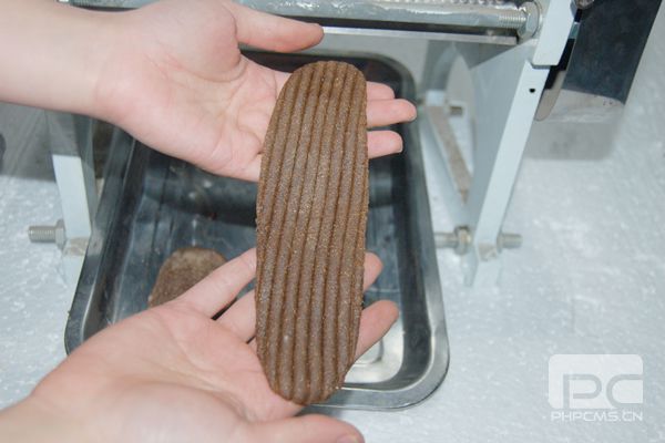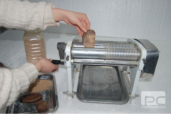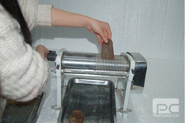 4 、制条:将已经压好中药饼放入纵向的放入制条工位,摇动摇手即可