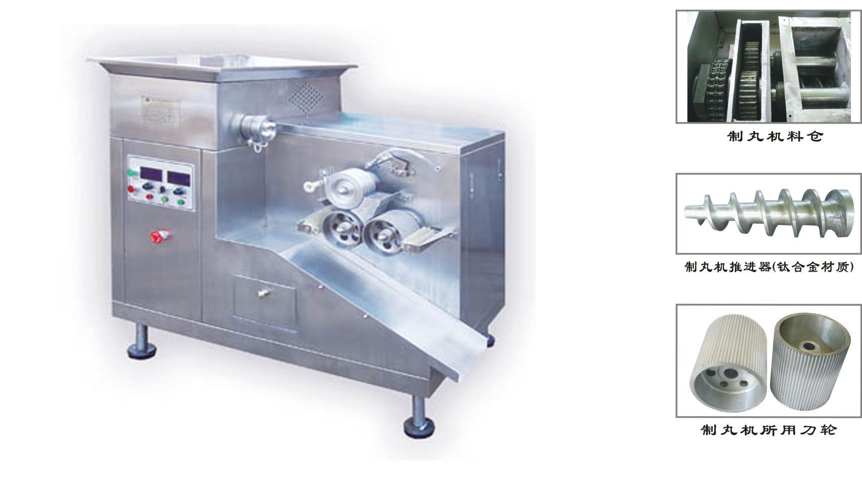 3、 出条部分空运转3-5分钟,无异常即可投料。折断出料条,返回料斗一部分,等料条合格后再开制丸部分,运行中加料应均匀。如发现出条和制丸不同步时可通过旋钮调节,顺时针制丸快,逆时针制丸慢。丸径大小可以通过更换不同的出条口和制丸刀及导轮来达到。